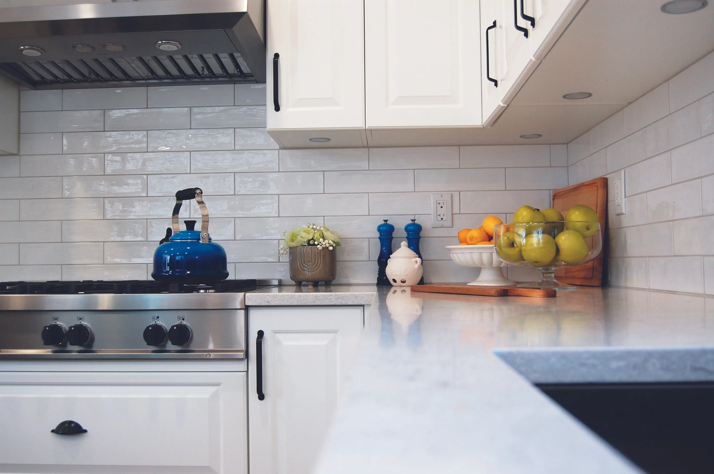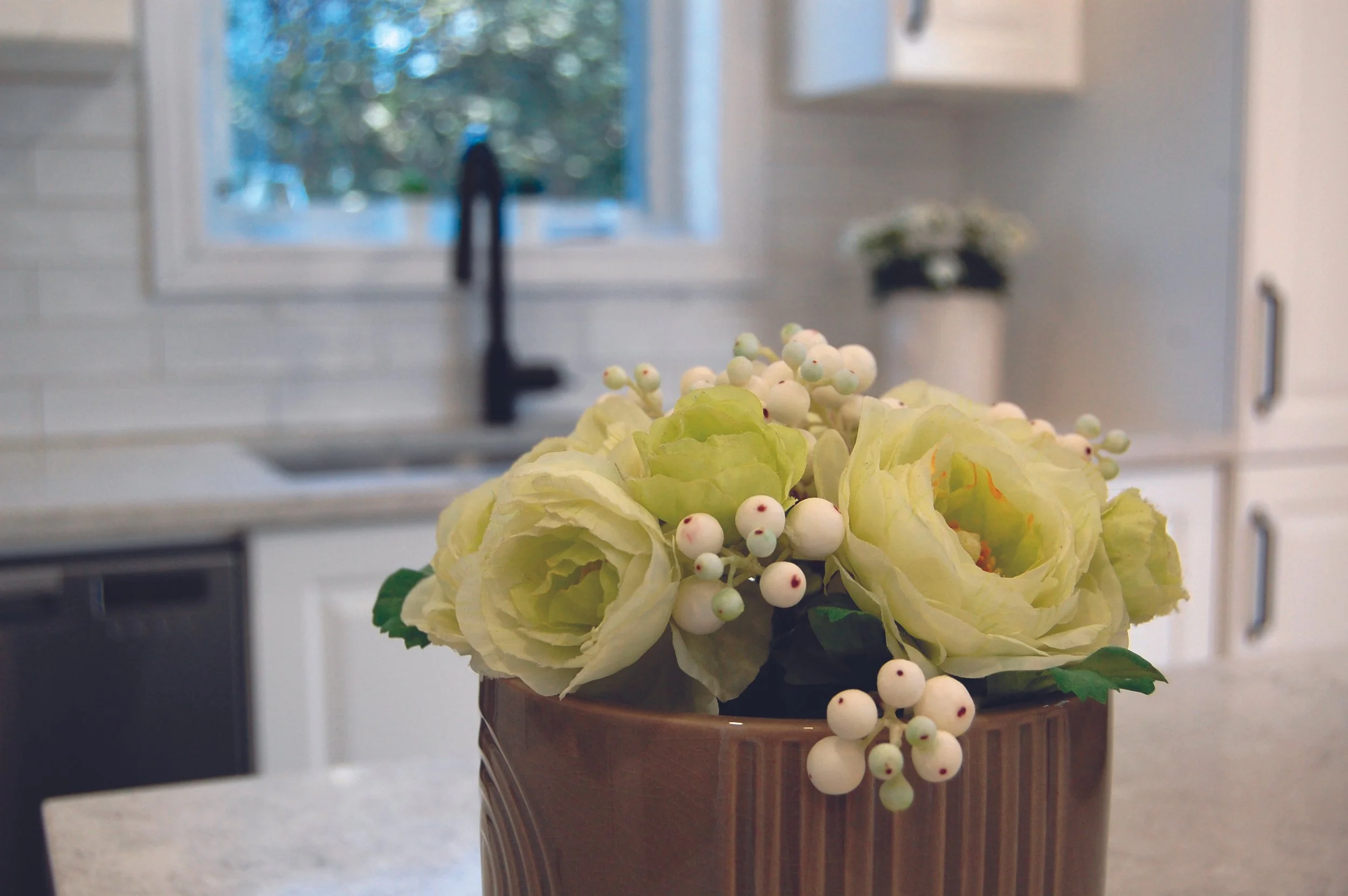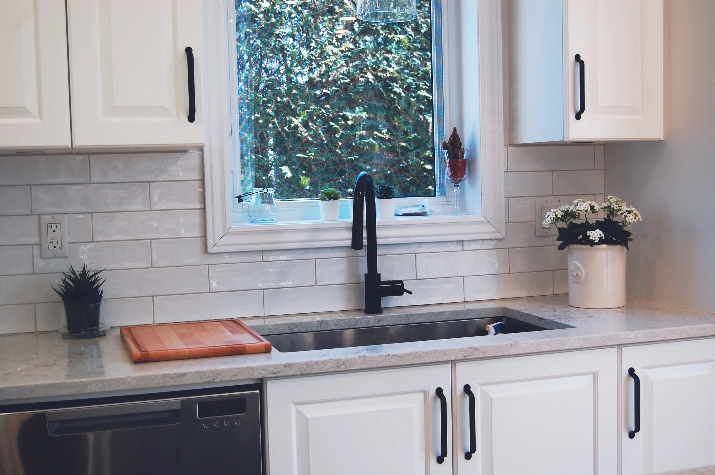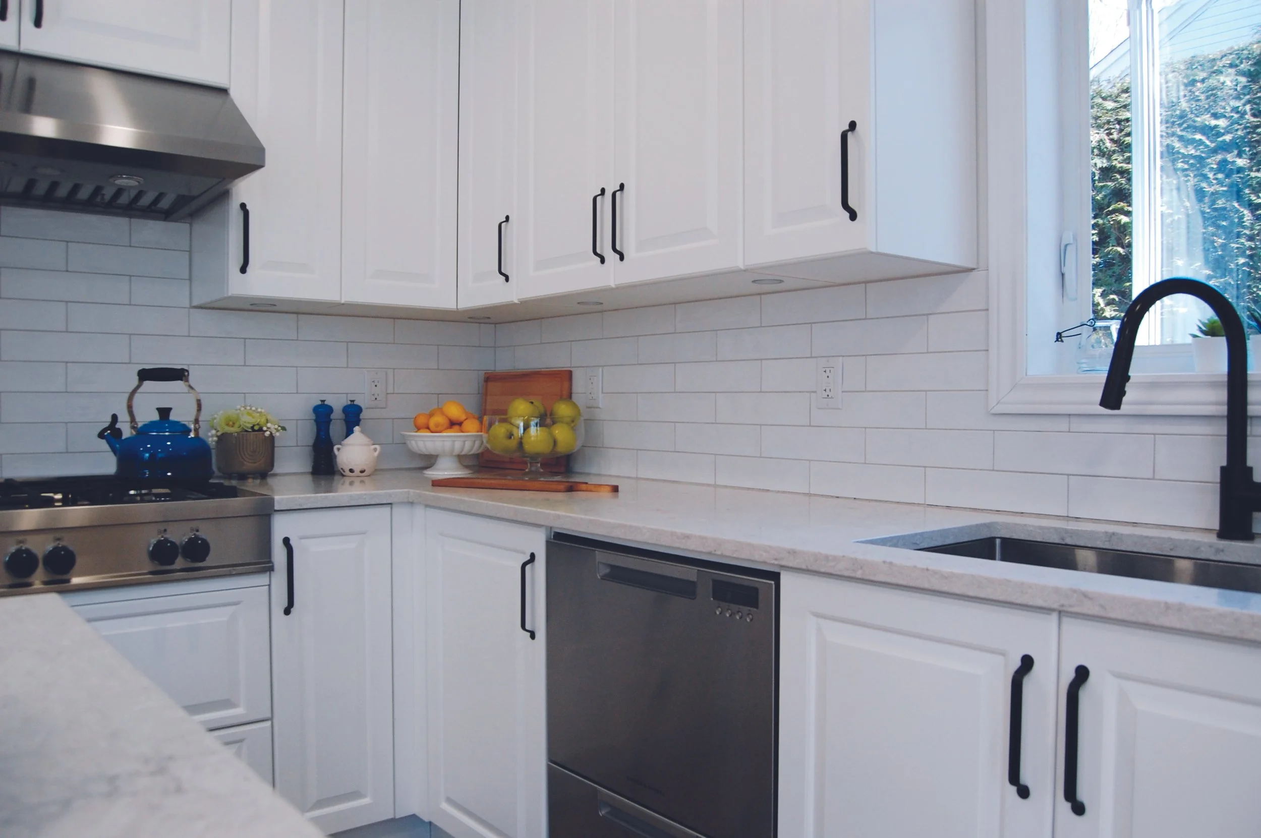 Cette cuisine épurée marie à la perfection sobriété et sophistication. Les armoires blanches à panneaux encastrés contrastent élégamment avec les poignées noires mates, tandis que les lignes droites du dosseret en carreaux allongés apportent une touche de modernité. Le comptoir en pierre naturelle, au veinage discret, offre une surface à la fois noble et fonctionnelle. Chaque élément — de la robinetterie noire au design minimaliste aux accessoires soigneusement sélectionnés — reflète un souci du détail et une vision raffinée de l’espace culinaire.